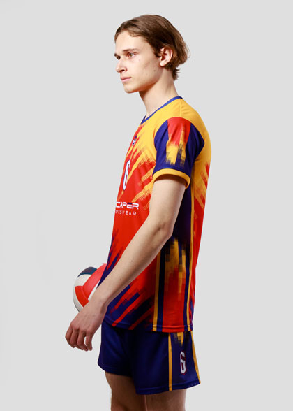 EscaperОписание: Волейбольная форма мужская. Футболка прямого силуэта. Вставки из перфорированной сетки по бокам. V-образная горловина. Втачной рукав с манжетой. Манжеты и горловина из рибаны. Шорты средней длины, свободного кроя с лампасами из фактурной сетки. Эластичный пояс со шнурком для регулировки. Полная сублимация — любой цвет и дизайн (уже входит в стоимость).